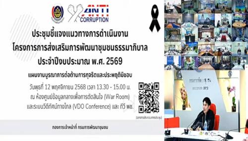 วันพุธที่ 12 พฤศจิกายน 2568 เวลา 13.30 น. นางสาวเสาวนีย์ บำรุงศรี พัฒนาการอำเภอเมืองอุทัยธานี พร้อมด้วยเจ้าหน้าที่พัฒนาชุมชนอำเภอเมืองอุทัยธานี เข้าร่วมประชุมแนวทางการดำเนินงานโครงการส่งเสริมการพัฒนาชุมชนธรรมาภิบาล ประจำปีงบประมาณ พ.ศ. 2569 แผนงานบูรณาการต่อต้านการทุจริตและประพฤติมิชอบ โดยรับฟังผ่าน TV พช. โดยมีวัตถุประสงค์ เพื่อซักซ้อมทำความ เข้าใจและเตรียมความพร้อมในการดำเนินงาน โครงการส่งเสริมพัฒนาชุมชนธรรมาภิบาล ประจำปีงบประมาณ พ.ศ. 2569 ในกิจกรรมที่ 1 - 5 ณ สำนักงานพัฒนาชุมชนอำเภอเมืองอุทัยธานี จังหวัดอุทัยธานี